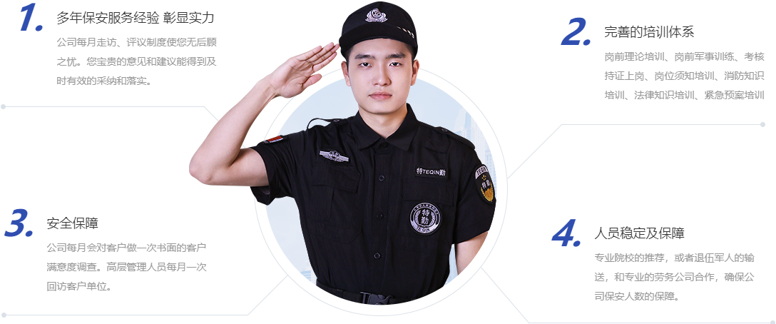 专业院校的推荐,或者退伍军人的输送,和专业的劳务公司合作,确保公司保安人数的保障。完善的培训体系